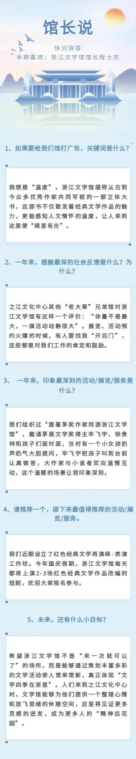一年之前,浙江文學(xué)館開(kāi)館活動(dòng)的主題是“回家”,程士慶認(rèn)為,內(nèi)核沒(méi)有變,文學(xué)館將成為像家一般溫馨的空間。歡迎“回家”,然后,再?gòu)倪@里重新出發(fā)。