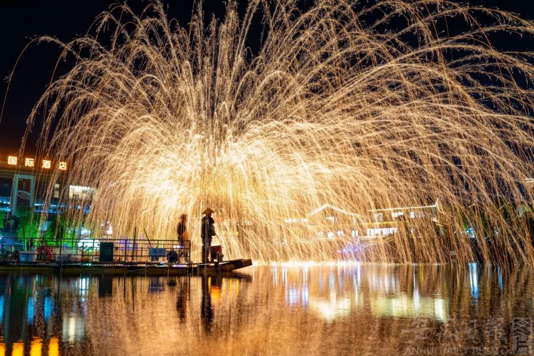 合肥市肥東縣撮街,專業(yè)人員在給游客表演打鐵花。阮雪楓 攝