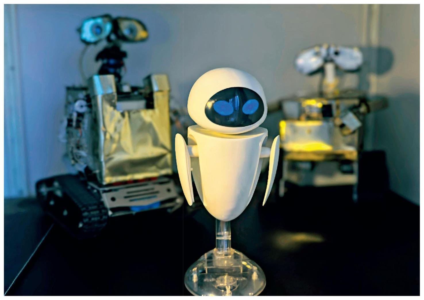 王元卓為女兒們制作的機(jī)器人伊娃(前)和瓦力。