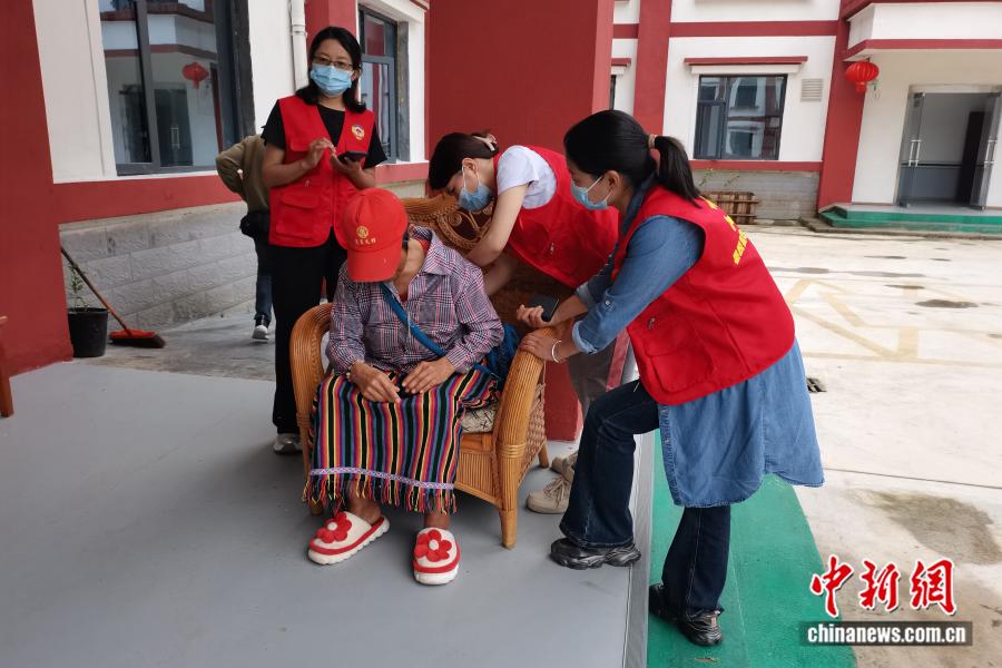 2025年5月23日,墨脫縣政協辦黨支部黨員干部與政協委員代表前往墨脫縣一家養老院開展活動。圖為黃小芳(右二)為行動不便老人按摩捶背。受訪者供圖