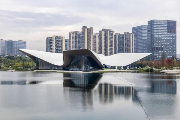 隨著成馬選手奔跑的背影逐漸遠去,記者一行人來到天府藝術公園文博坊。文博坊由天府美術館、當代藝術館、天府人文藝術圖書館、天府111商業水街、迎桂湖等組成,是成都“八街九坊十景”中“十景”之一的地標公園。