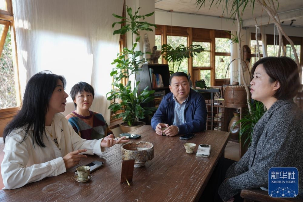 11月14日,民宿主徐小風(fēng)(左二)、董鳳潔(右一)與東山村黨支部書記、村委會(huì)主任徐佩倫(右二)、東山村鄉(xiāng)村CEO胡亮玉(左一)在一起討論民宿及文旅綜合體項(xiàng)目發(fā)展。(新華社記者 黃宗治/攝)